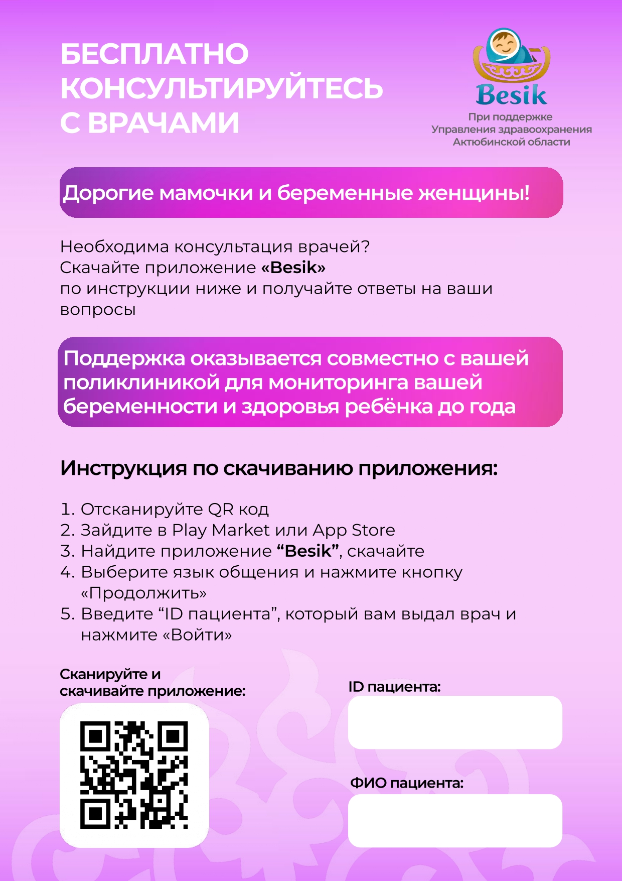 При поддержке Управления здравоохранения Актюбинской области в целях контроля за здоровьем беременных женщин и детей до одного года в интернет-систему было загружено приложение «Besik», и в городской поликлинике №6 ведётся работа в данном направлении.